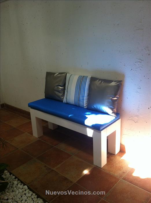 FABRICACION DE BANQUETA , (MADERA CEDIDA POR VECINOS DE 1º C) , PINTADO Y COLOCACION DE COJINES A MEDIDA.
