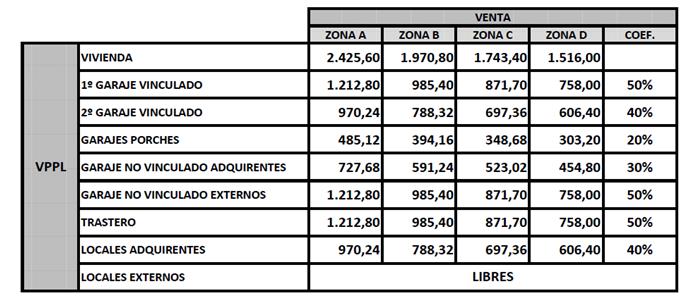 Según dice la Comunidad de Madrid, habría que multiplicar los 2.425,60 €/m2 por los m2 útiles computados según indican. Es la superficie que se indica normalmente como superficie VPPL en los presupuestos de las promotoras. También habría que multiplicar 1.212,80 €/m2 por las superficies de trastero y plaza de garaje y sumarlo todo (IVA aparte).