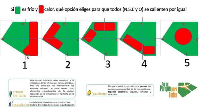 Hay otras propuestas que ofrecen un Parque Grande en forma de anillo circular conectado entre si por eco-puentes, pasarelas o túneles. Permitiría la colocación de los edificios en el centro evitando problemas de ruido y acumulación del efecto isla de calor en una zona determinada; evitaría la acumulación de tráfico en el perímetro de la manzana central y sus vías secundarias; y facilitaría la colocación del intercambiador que conecte en el futuro al barrio en todas sus direcciones.