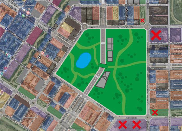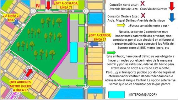 El problema también afecta y mucho a las conexiones del futuro transporte público con el intercambiador de la manzana central . Este deberá conectar: