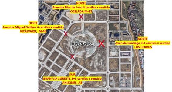 Una de las consecuencias de la propuesta de modificación de la etapa 2, conocida a través de RRSS, es el cambio RADICAL del flujo del tráfico que afecta a los ejes norte- sur y este - oeste. Fueron diseñados para permitir la conexión entre los PAUs que rodean al Cañaveral (Los Cerros y Los Ahijones) y dar salida hacia las grandes vías que lo bordean: A-3, M-45 y M-50.