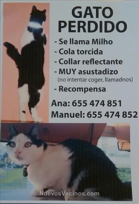 Se nos acaba de escapar unos de nuestros gatos de casa (se llama Milho). Vivimos en Viloria de la Rioja 14 (esquina con Valcarlos). Hace menos de una hora que no está, así que debe de andar cerca. Responde al nombre de Milho pero es muy asustadizo, así que si alguien intenta cogerlo, seguro saldrá corriendo (jamás se ha mostrado agresivo con nadie, pero no se dejará coger). Por favor, si lo véis llamad al 655 474 851 (Ana) o al 655 474 852 (Manuel). Lleva un collar plateado reflectante.
