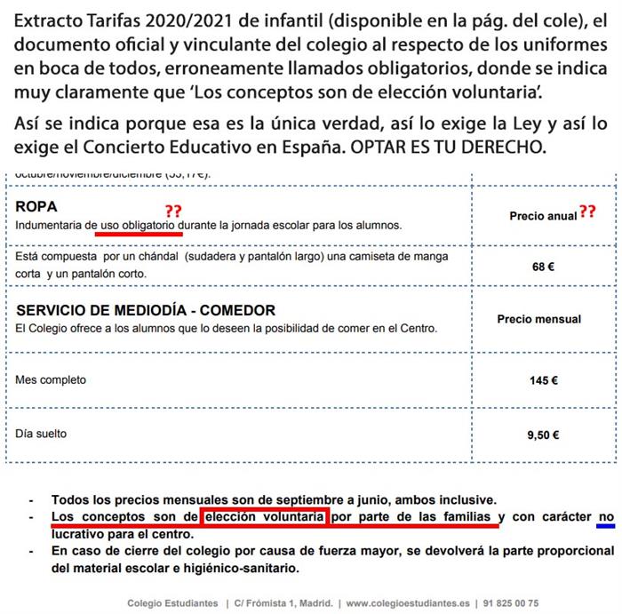 La realidad es muy muy sencilla de comprobar: en las tarifas para infantil, que es el documento oficial y vinculante del colegio al respecto, se indica de forma clara que ‘todos los conceptos son opcionales’. Así hay que indicarlo porque esa es la única verdad, como así lo exige la Ley y el Concierto Educativo. Por favor, podeis comprobarlo en las tarifas de la web del colegio.