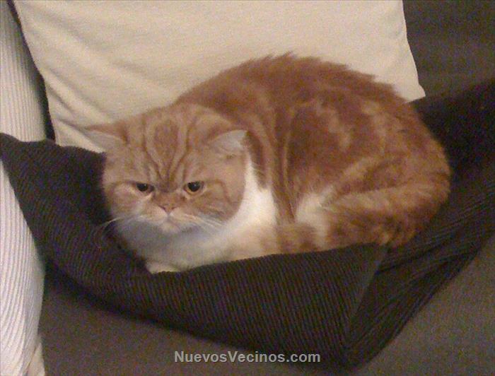 Hemos perdido un gato de 11 años pero parece mucho mas joven es clavado a Garfield: pecho blanco y rayas pelirrojas. Sus ojos don naranjas, como su pelo. Es de raza exotica asi que tiene el pelo semilargo.
