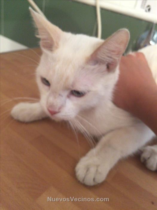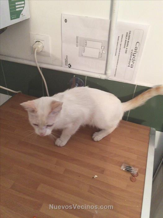 Es muy docil, se deja coger y es pequeño. Es de color blanco y tiene los ojos azules. Esta un poco delgado pero se le ve sano.