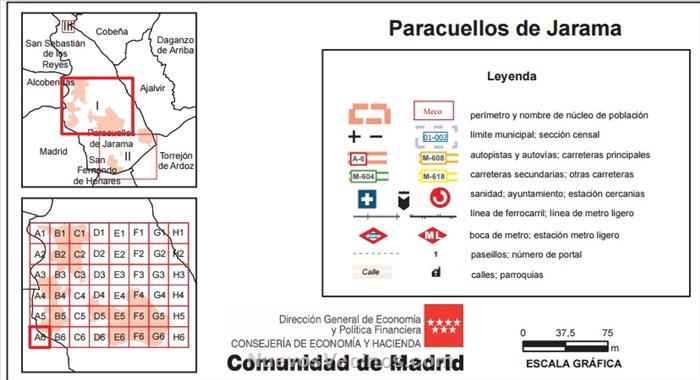 La comunidad de Madrid tiene en web, unos documentos en formato PDF con los planos detallados de cada una de las poblaciones de la comunidad. El de Paracuellos lo podeis consultar aqui.