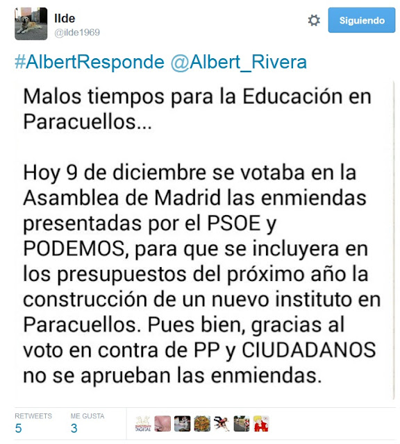Si se trataba de que lo preferían llamar “IES Albert Rivera”, pues lo llamamos así, no creo que ni los de los otros partidos de Paracuellos protestaran con tal de tenerlo, ya que todos han mostrado su compromiso (salvo quizás el PP, que además de dejar claro su compromiso, querría llamarlo “IES Zurrita”)