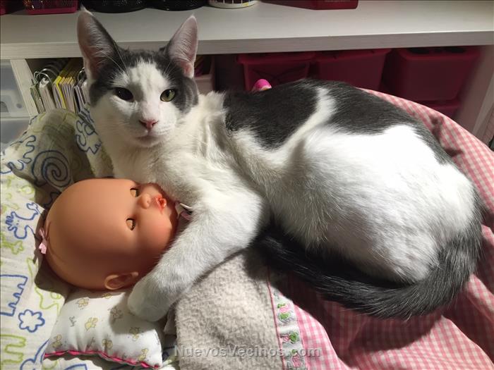 Es macho y se llama Núvol, tiene un año aprox, tiene chip. Es un gato muy cariñoso.