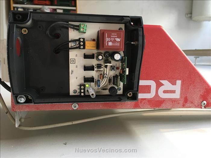 - Abrir el receptor adosado al motor de la puerta. Pulsar el botón de sincronización (al lado del led rojo que está apagado en la foto, al lado de la placa vertical de la derecha). Se escucha un pitido.