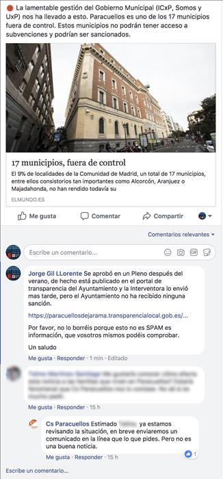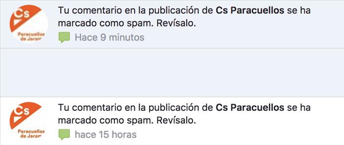Lo que no es normal, es que un partido político que aspira a gobernar este pueblo, elimine un comentario en facebook, de un vecino como yo, que lo único que ha hecho ha sido explicar una publicación que han replicado de el mundo, que también se ha publicado aquí. Pues nada, ni cortos ni perezosos la califican de SPAM y lo borran, pero no solo una vez, me lo han borrado dos veces, de la segunda tengo un pantallazo, que hay que ser precavido.