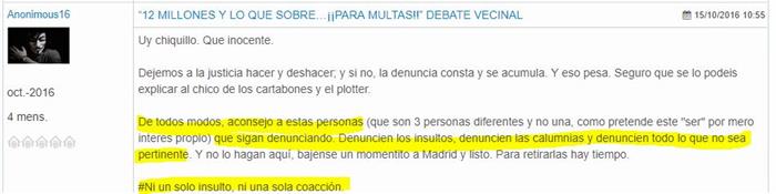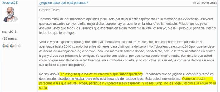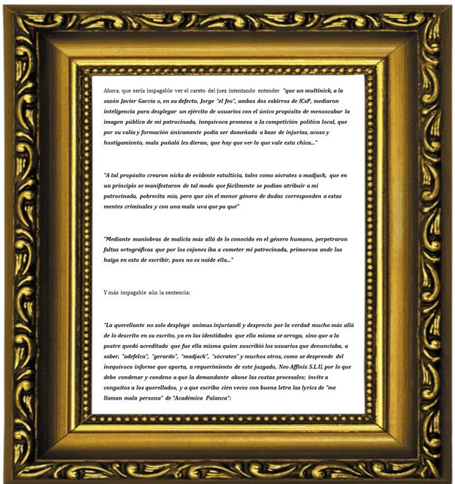 "La querellante no solo desplegó animus injuriandi y desprecio por la verdad mucho más allá de lo descrito en su escrito, ya en las identidades que ella misma se arroga, sino que a la postre quedó acreditado que fue ella misma quien suscribió los usuarios que denunciaba, a saber, "adefelca", “gerardo”, “madjack”, “sócrates” y muchos otros, como se desprende del inequívoco informe que aporta, a requerimiento de este juzgado, Neo Affinis S.L.U, por lo que debo condenar y condeno a que la demandante abone las costas procesales; invite a conguitos a los querellados, y a que escriba cien veces con buena letra las lyrics de "me llaman mala persona" de "Académica Palanca":