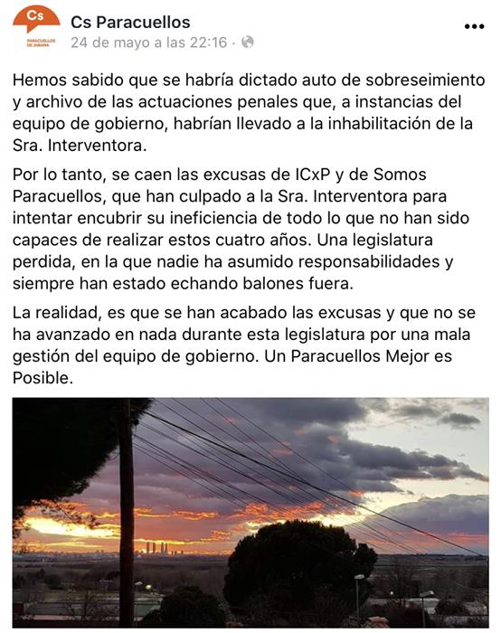 Gracias por defender y fomentar el incivismo, el alarmismo e incluso utilizar las catástrofes naturales como arma arrojadiza para hacernos ver que con el anterior Equipo de Gobierno vivíamos en un pueblo sucio, peligroso y mal cuidado pero que ahora con vosotros Paracuellos luce limpio, seguro y perfectamente cuidado.