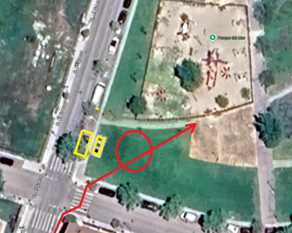 en rojo, trayectoria aproximada andando y zona donde se aparcó la bicicleta.