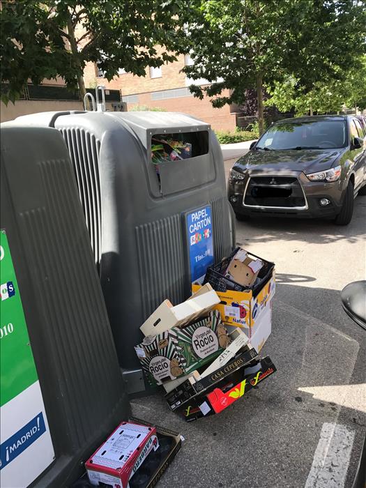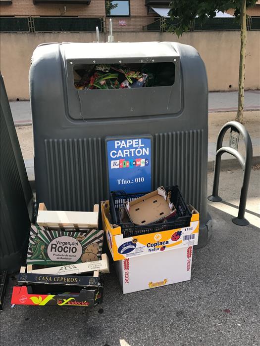 Estas fotos estan sacadas el sábado por la mañana. Ya no es que dejemos fuera del contenedor todas las cajas, es que además dejamos allí abandonadas cajas de madera, plastico, etc...Hay que ser sucio y querer poco a tus clientes.