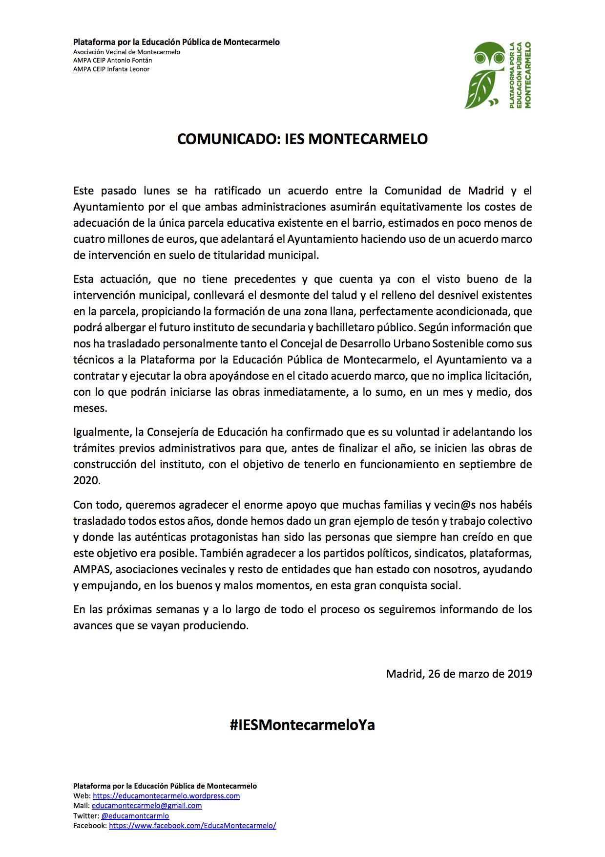 De todas formas, permitidme que insista, hace años se planteó el cierre del Instituto de Mirasierra y su traslado a esta parcela, cuando las obras del metro. En ese momento no se dijo que la parcela no era apta. Evidentemente gobernaba el mismo Partido Político la comunidad y el ayuntamiento y no estaban a la gresca como Ahora en Madrid.