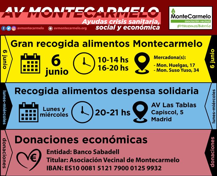 Desde la Asociación Vecinal de Montecarmelo hemos organizado una gran recogida de alimentos para el próximo 6 de junio. Estaremos de 10:00 a 14:00 hs y de 16:00 a 20:00 hs frente a los dos Mercadona del barrio. Pásate y dona tus alimentos y productos de primera necesidad para las familias que más lo necesitan en estos duros momentos.