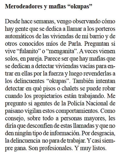 Lo de los okupas en Parla y la impunidad de la que gozan es tremendo, imagino eso sí, que como en cualquier municipio. ES una vergüenza.