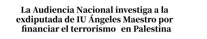 En enero de 2019 fue investigada por la Audiencia Nacional por un supuesto delito de financiación del terrorismo. Durante los años 2014 y 2015 realizó dos colectas para recaudar ayuda humanitaria en Palestina tras los ataques de Israel.3? Dicho dinero fue entregado a Leila Khaled, militante del Frente Popular para la Liberación de Palestina, considerada organización terrorista por Estados Unidos4?,? Canadá5?,? y la Unión Europea”.