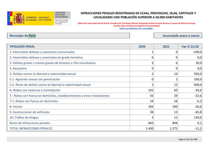 Si tomamos datos de las grandes poblaciones del sur de la Comunidad de Madrid vemos como en Leganés, Getafe, Móstoles o incluso Pinto presentan unas cifras de infracciones penales muy similares a los Parla.