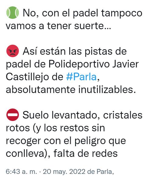 La Concejalía de Deportes del Ayuntamiento de Parla anuncia el arreglo inminente de las pistas de tenis del polideportivo Francisco Javier Castillejo.