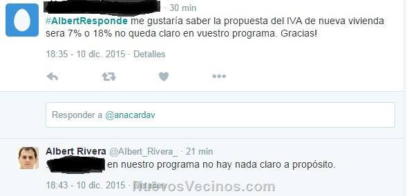 He enviado un email a Ciudadanos para que nos aclaren que IVA tienen previsto aplicar a la compra de nueva vivienda hace ya una semana y todavía no tengo respuesta. Hoy he llamado al móvil que aparece en su página web y no contestan tampoco.
