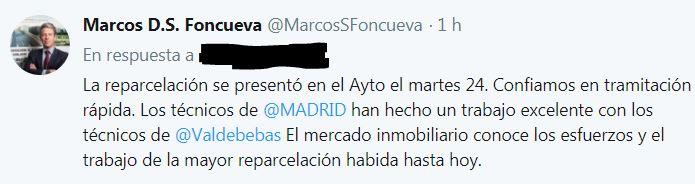 “La Asamblea de la Junta de Compensación acordará este próximo lunes 23 sobre la elevación de la reparcelación a la tramitación municipal. El martes 24 quedará presentada, en su caso, en el Ayto para su tramitación municipal. Esperamos una tramitación lo más rápida posible.”