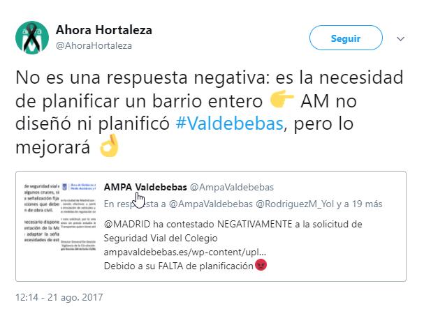 Es muy lamentable y ademas demuestran una gran torpeza. Si a los vecinos les pones un cartel de precaución por proximidad de un colegio y templas la zona no es necesario prácticamente nada mas, sin embargo sin que nadie les haya preguntado sobre qué les parece el barrio de Valdebebas (urbanísticamente en mi opinión es un ejemplo muy positivo para posibles futuros desarrollos) se “mean” en todo el barrio sin pestañear…, desde luego no tienen ni idea de hacer ciudad.