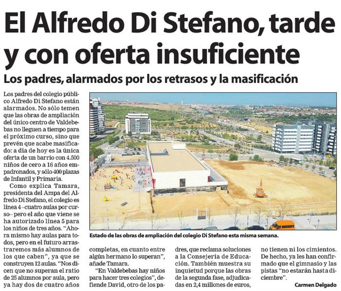 Se ha construido la primera fase del CEIP ALFREDO DI STÉFANO para el curso 2017-18, con ocho aulas de Educación Infantil que dieron respuesta a todas las solicitudes que se cursaron el pasado proceso de adminisión, sin que ninguna solicitud quedara sin plaza. Para el próximo curso el centro doblará su capacidad y conformará sus grupos de acuerdo a la dimensión del mismo.