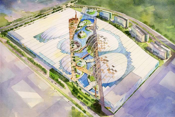 La idea generadora del diseño ha partido de la base de la unificación de las dos parcelas a través de un espectacular parque urbano y acuático con actividades atractivas y libres cuyo vehículo conductor son las islas de la mitología griega.