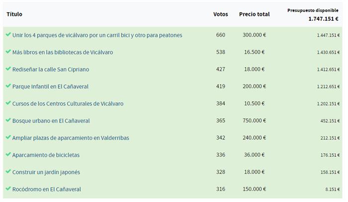 Resultados presupuestos participativos Vicálvaro