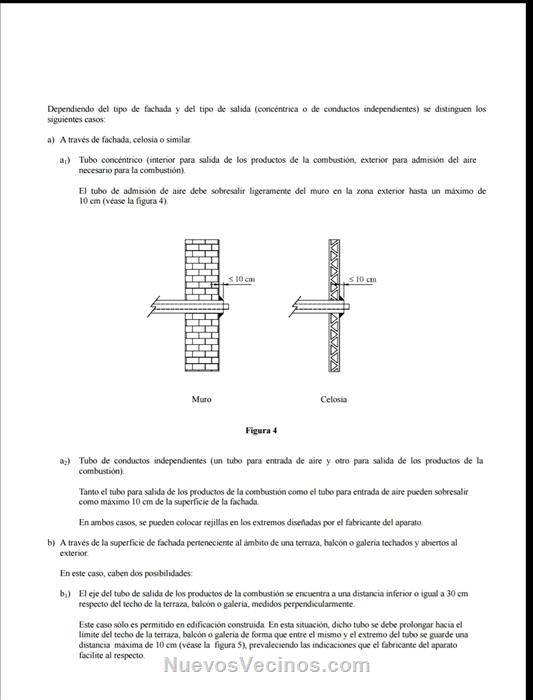 La salida de productos de la combustión debe distar al menos 1 m de pared lateral con ventanas o huecos de ventilación, o 30 cm de pared lateral sin ventanas o huecos de ventilación.