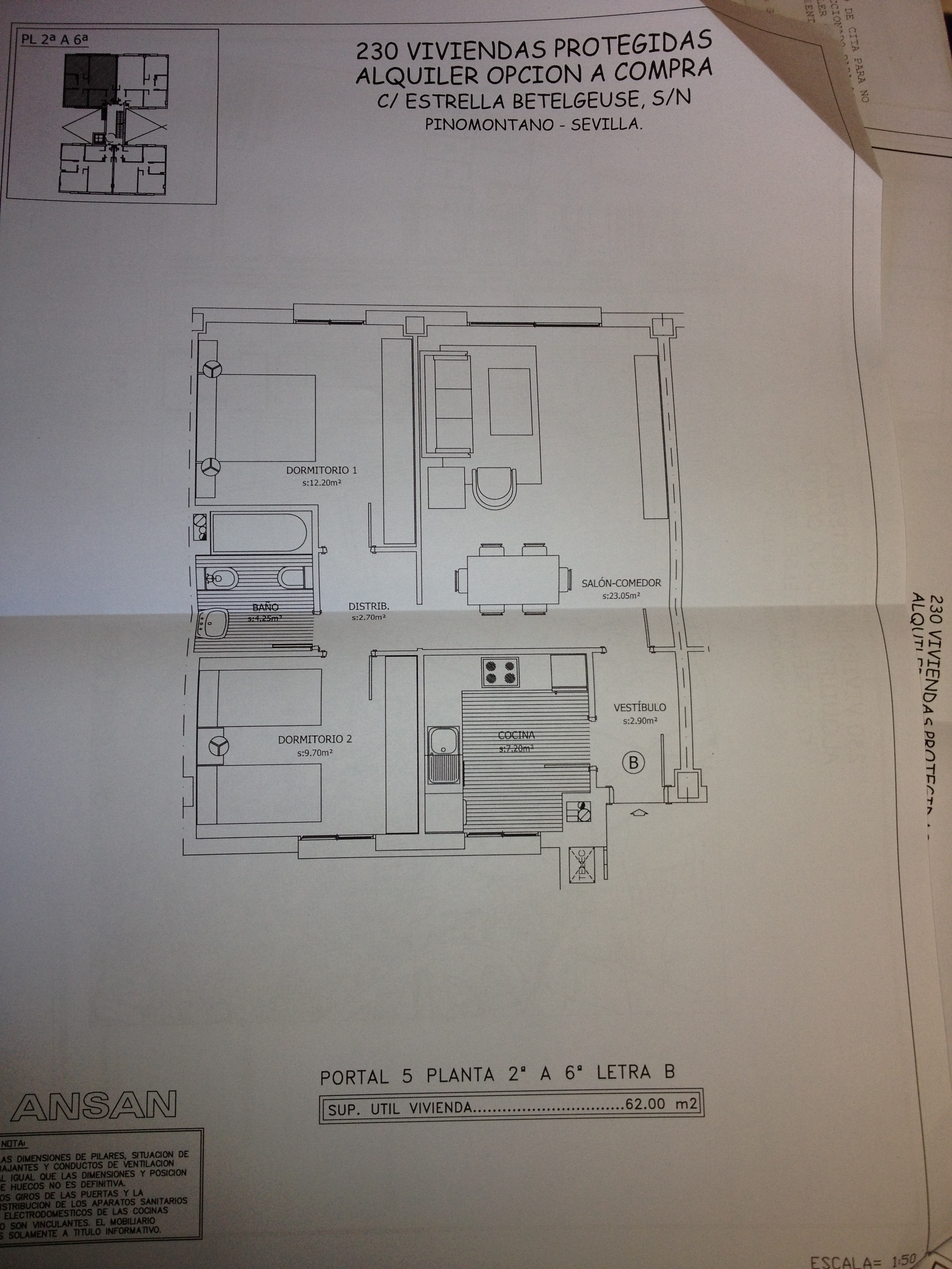 Piso de dos dormitorios, 62 metros cuadrados.