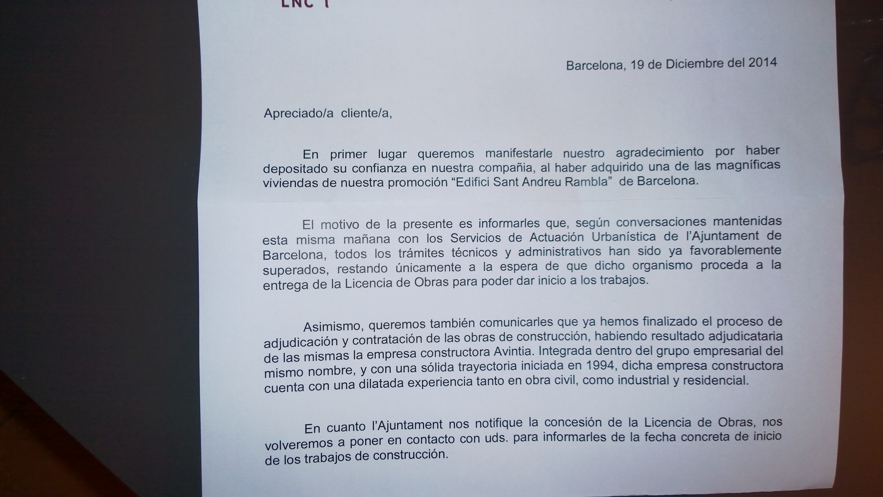 Tu indicas....según hemos leído, la licencia puede tardar hasta dos meses, si es así hay que pensar en marzo como fecha inicio de las obras....." Si la carta esta fechada en Diciembre, y cito, quedan a la espera...es por que ya esta solicitada...no se...no me cuadra...nada