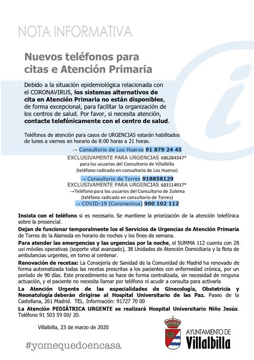 El teléfono al que hay que llamar es al de los consultorios de Los Hueros o de Torres, por este orden. Las llamadas que se realicen al teléfono del consultorio de Villalbilla las han desviado al teléfono del consultorio de Los Hueros. El teléfono del consultorio de Zulema, no está habilitado para conceder citas.