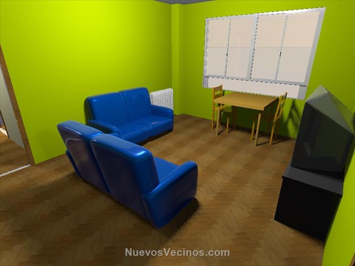 Quería preguntaros como tenéis pensado distribuir el salón los que tengáis, como yo, el piso de 2 dormitorios. Yo he trasteado con SweetHome 3D y de momento tengo las 2 opciones de las imágenes. Creo que el radiador de la calefacción "estorba" donde lo han puesto, ya que en esa pared pondría un sofá al estar la toma de tv en la pared de enfrente.