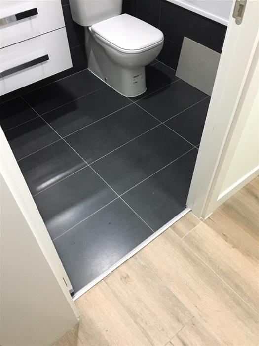 Una de las cosas que queremos hacer y que es más importante para nosotros es poner en los baños el mismo suelo que en toda la casa. Nos gusta mucho que el suelo sea igual en toda la casa, y que esta uniformidad se rompa en los baños no nos agrada. Además, el gres porcelánico es un material ideal para poner en baños, y el tono madera va muy bien con todas las opciones de azulejos que ofrecen.