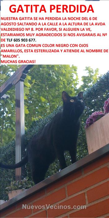 Es una gata negra común con ojos amarillos, está esterilizada y atiende al nombre de "Malon". Creemos que ha saltado por la terraza a la altura del Bajo de Avda Valdediego nº 8.