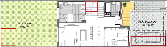 - En el patio delantero. Quizá sea la mejor opción, aunque también contemplo poner un porche en la zona indicada, para un sólo coche. No me gusta que esté tan a la vista…