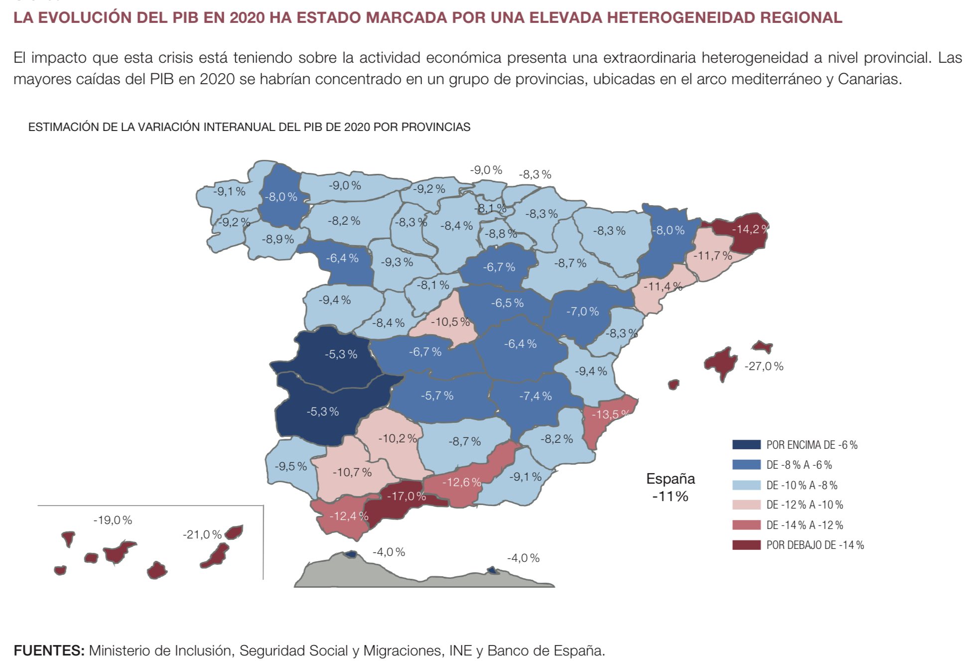 El informe del Banco de España incluye un mapa en el que se puede ver la caída de la actividad por provincias.