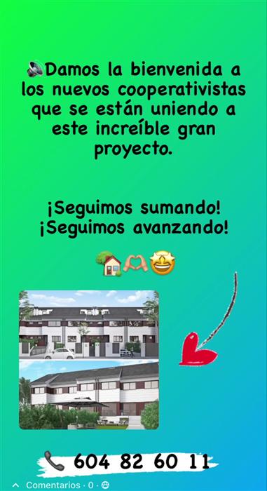 Hola! Hoy ya hemos reservado en la promoción! Con ganas de empezar a ver los primeros días de las obras. Si tenéis algún grupo de WhatsApp de los cooperativistas nos gustaría unirnos. Gracias!