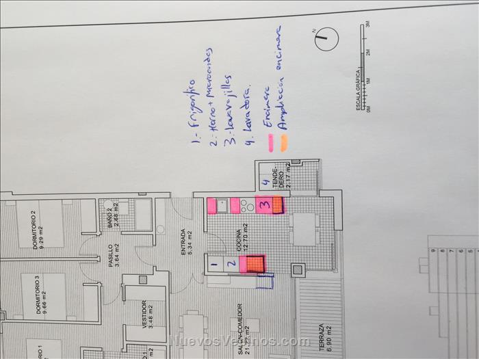 El tema es sobre la cocina. Tenemos una cocina que a mi parecer es grande y está bien, pero está muy mal distribuida. Si tenemos en cuenta modulo de frigorífico, modulo de horno+microondas, casi no tenemos encimera. Por el otro lado, el fregadero se ve pequeño y queda muy poco hueco.
